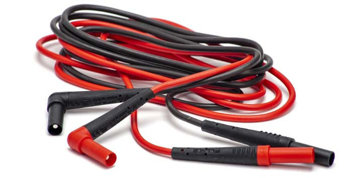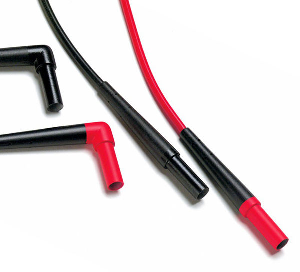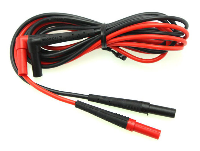 Испытательные провода DMM (красный, черный) с защитной оболочкой, стандартными заглушками. Прямоугольный разъем на одном конце и прямой разъем на другом. Усиленная защита от натяжения. 1,5-метровый силиконовый провод выдерживает тепло и холод