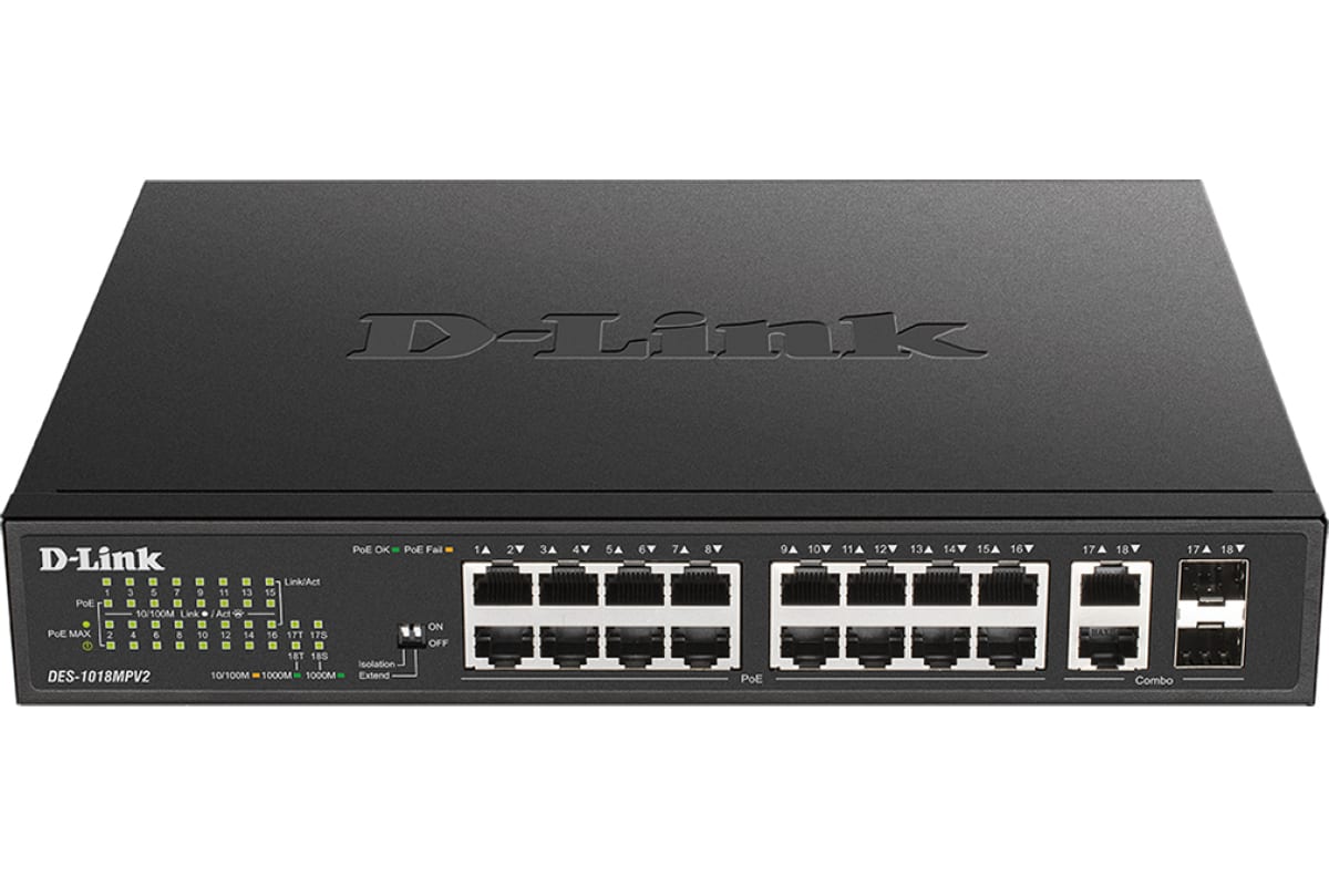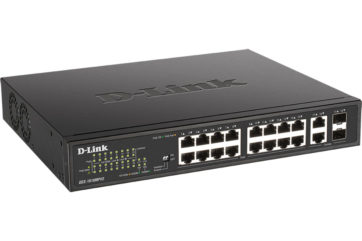 Технические характеристики d-link с 16 портами 10/100base-tx и 2 комбо-портами 100/1000base-t/sfp DES-1018MPV2/A1A