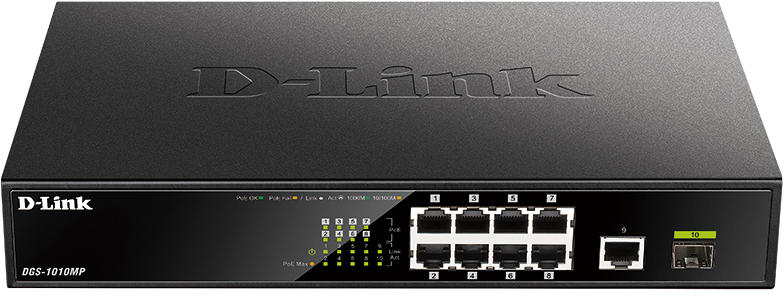 Неуправляемый коммутатор с 9 портами 10/100/1000Base-T, 1 портом 1000Base-X SFP, функцией энергосбережения и поддержкой QoS (8 портов с поддержкой PoE 802.3af/802.3at (30 Вт), PoE?бюджет 125 Вт)