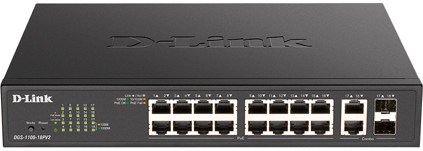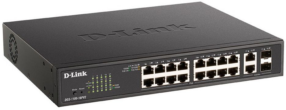 Интерфейсы 16 портов 10/100/1000Base-T с поддержкой PoE 2 комбо-порта 1000Base-T/SFP