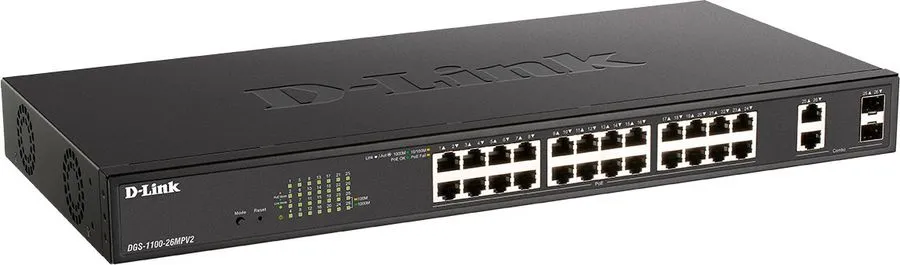 Коммутатор DGS-1100-26MPV2, кабель питания, 2 крепежных кронштейна для установки в 19-дюймовую стойку, 4 резиновые ножки, комплект для монтажа, краткое руководство по установке.