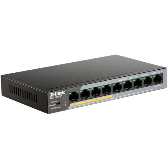 Коммутатор DSS-100E-9P автоматически определяет необходимость передачи данных на увеличенное расстояние без применения каких-либо настроек. Коммутатор поддерживает передачу данных и подачу питания по Ethernet-кабелю на расстояние до 250 м.1 При использовании дополнительных PoE-повторителей DPE-302GE дальность подключения можно увеличить до 650 м.