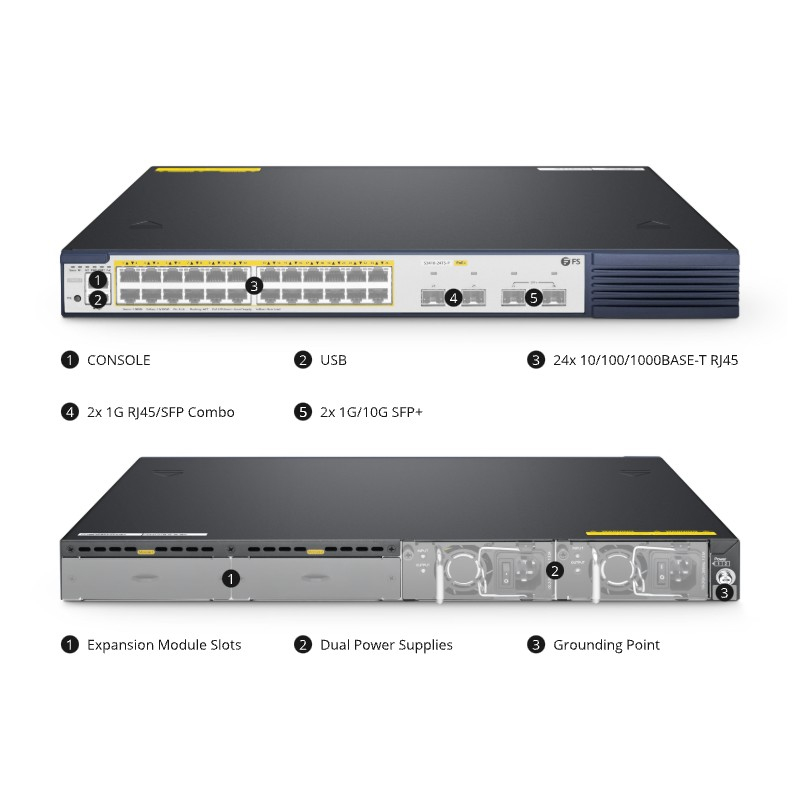 24 x 10/100/1000BASE-T RJ45 | 2 x 1G/10G SFP+, 2 x 1G RJ45/SFP Combo