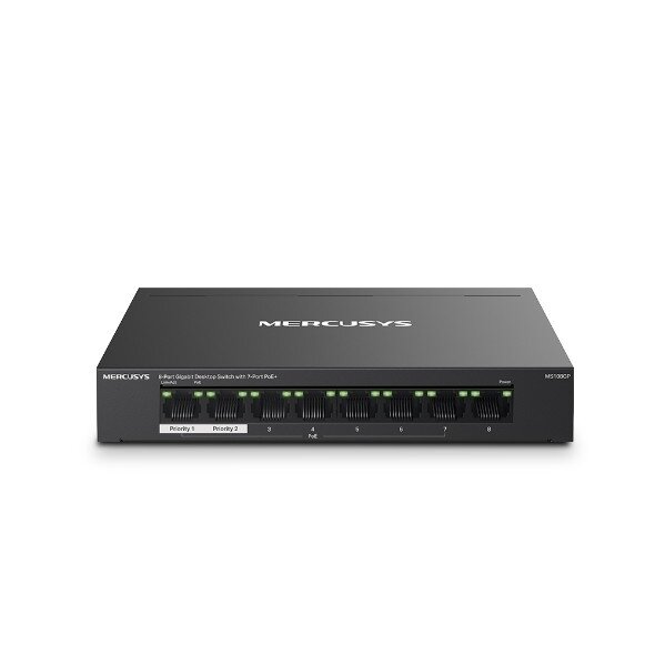 - Семь портов PoE+: позволят подавать питание и передавать данные по одному кабелю.