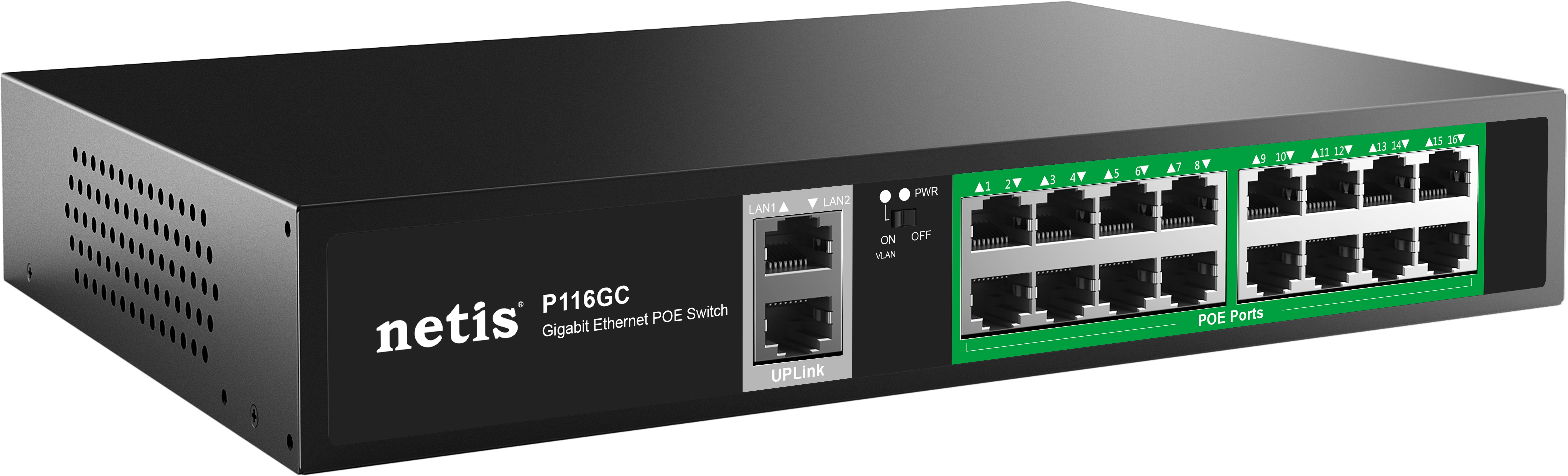 Коммутатор netis P116GC имеет 16 портов 1000 Мбит/с с поддержкой POE (Power over Ethernet), предоставляющих и данные, и питание, 2 порта 1000 Мбит/с для подключения к сети или другим устройствам посредством RJ45, максимальная мощность одного порта - 30 Вт, максимальный бюджет PoE коммутатора - 240 Вт. Коммутатор поддерживает функцию Watchdog - автоматическую детекцию зависшего оборудования и перезагрузку питания PoE на порту и функцию Port VLAN.