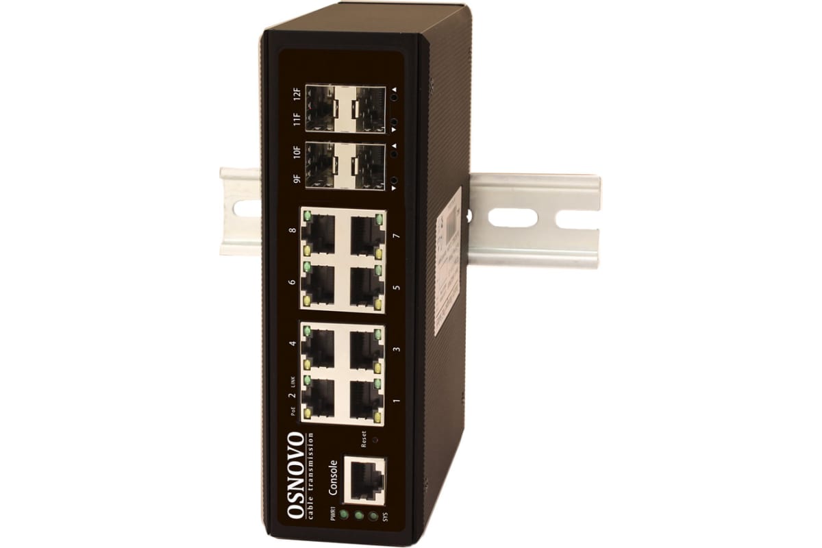 Промышленный управляемый (L2+) коммутатор Gigabit Ethernet на 8 GE Rj45 + 4 GE SFP порта. Порты: 8 x GE (10/100/1000Base-T) + 4 x GE SFP (1000Base-X). Уровень управления L2 (Full Managed). Питание DC12-55V. БП в комплект НЕ входит. Монтаж на DIN-рейку. Встроенная грозозащита 6kV. Размеры (ШхВхГ): 53,5x165x123мм. Рабочая температура: -40…+75°С
