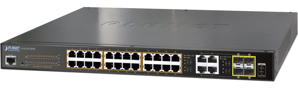Коммутатор Planet GS-4210-24PL4C IPv6/IPv4 24-Port - управляемый коммутатор с 24-я портами 10/100/1000T 802.3at PoE + 4-и порта Gigabit TP/SFP Combo.