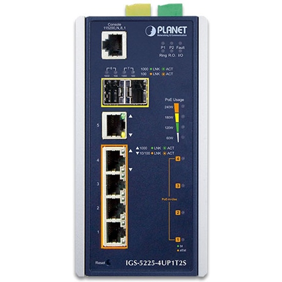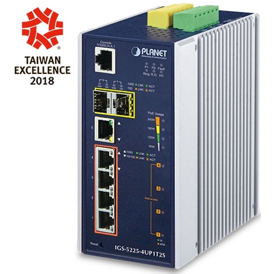 В соответствии с технологией IEEE 802.3bt Power over Ethernet Plus Plus последняя версия PLANET IGS-5225-4UP1T2S L2+ промышленный управляемый коммутатор PoE ++ оснащен четырьмя портами 10/100 / 1000BASE-T 802.3bt PoE++, каждый порт с мощностью до 95 Вт, один дополнительный медный порт 10/100 / 1000BASE-T. и два SFP-интерфейса 100 / 1000BASE-X в прочном металлическом корпусе IP30 для стабильной работы в тяжелых промышленных условиях. Он поддерживает богатые режимы работы PoE, включая 90-ваттные порты 802.3bt type-4 PoE ++ , 95-ваттный PoH (Power over HD-BASE-T) и 4-парный принудительный режим для решения проблемы несовместимости нестандартных 4-парных PoE PDs в полевых условиях.
