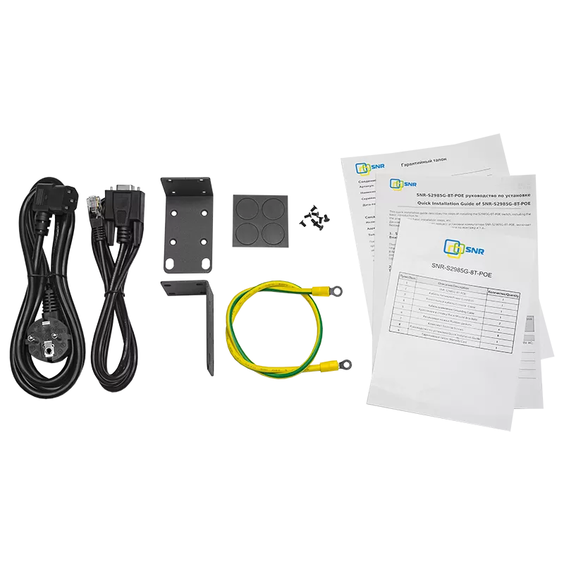 Комплект поставки Коммутатор; Кабель питания; Разъем DC питания; Консольный кабель; Крепления в стойку (2 шт.); Резиновые ножки (4 шт.); Набор болтов; Руководство по установке; Гарантийный талон.
