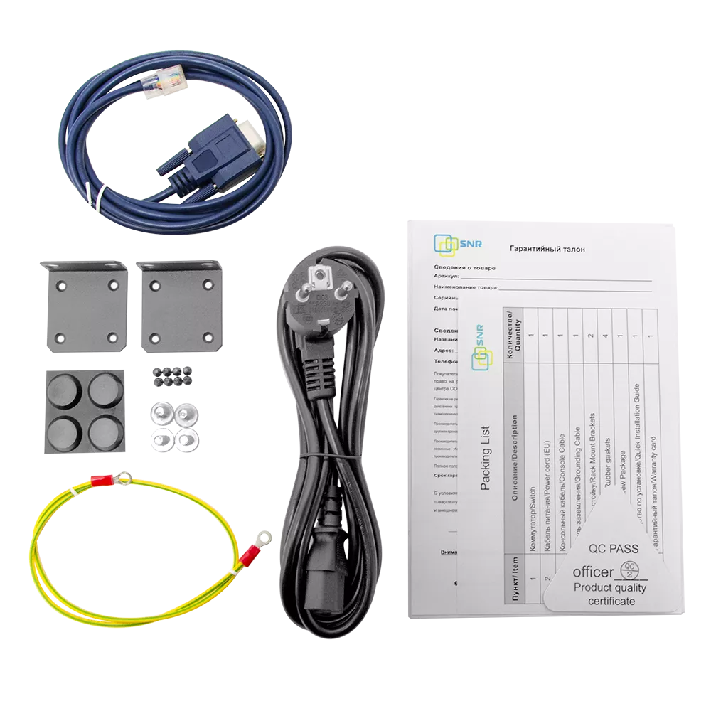 Комплект поставки Коммутатор; Кабель питания; Консольный кабель; Кабель заземления; Крепления в стойку (2 шт.); Резиновые ножки (4 шт.); Набор болтов; Руководство по установке; Гарантийный талон.