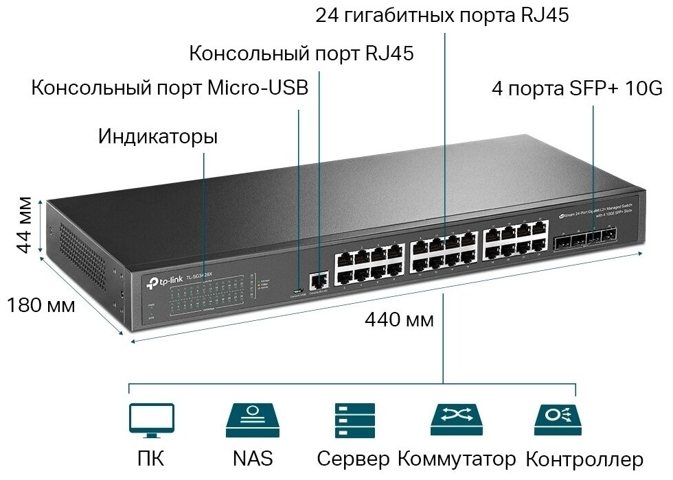 Интерфейсы • 24 порта 10/100/1000 Мбит/с RJ45