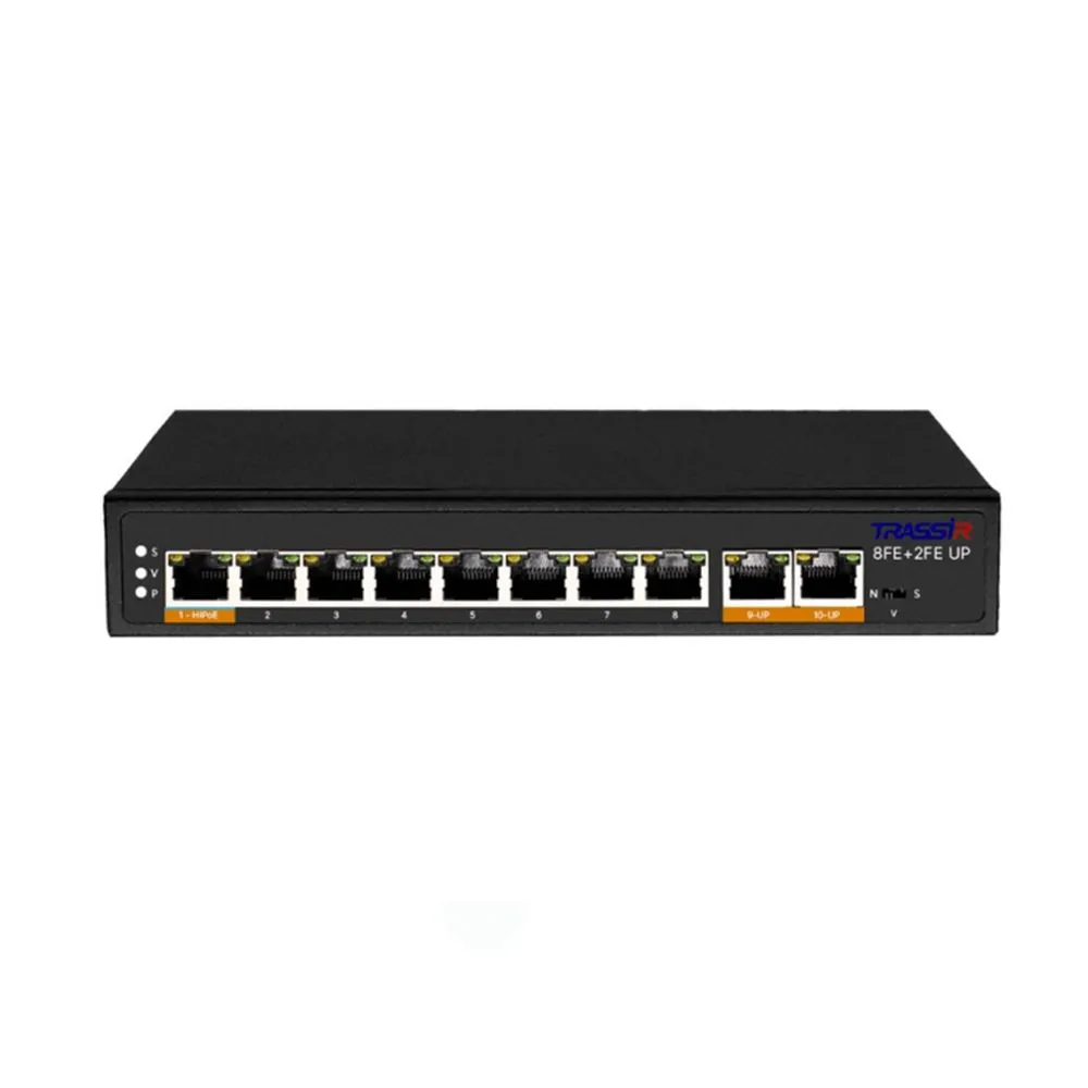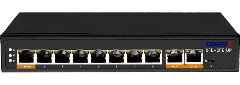 Неуправляемый РоЕ-коммутатор TRASSIR TR-NS1110-120-8PoE оборудован восемью PoE-портами RJ-45 Fast Ethernet, двумя uplink-портами RJ-45.