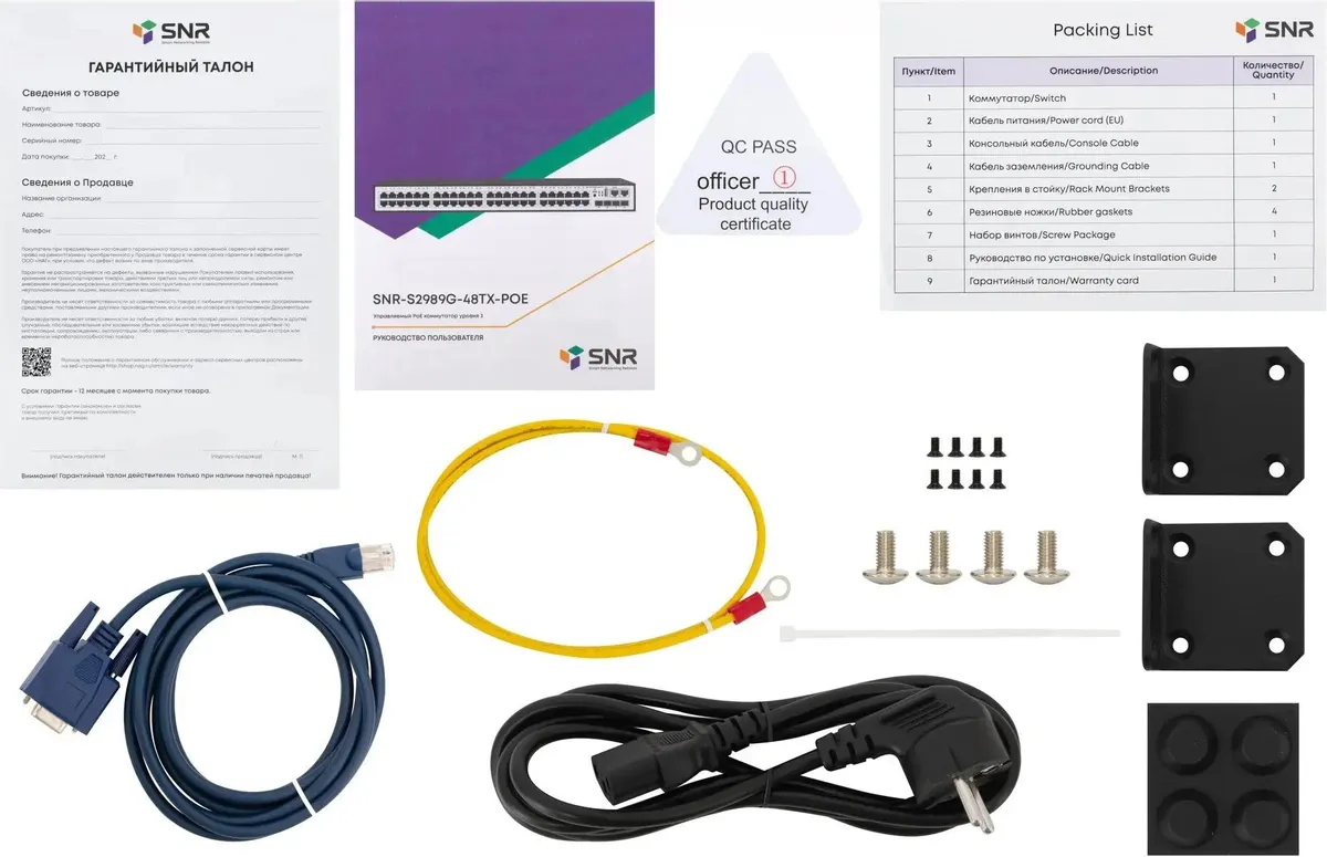 Коммутатор кабель питания; консольный кабель; крепления в стойку (2 шт.); резиновые ножки (4 шт.); набор болтов; руководство по установке; гарантийный талон.