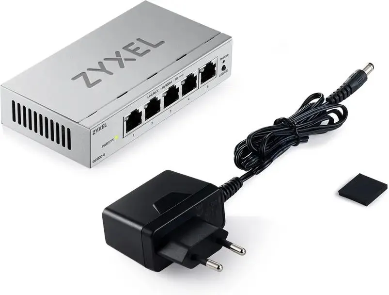 Коммутатор, блок питания, резиновые накладки, документация.