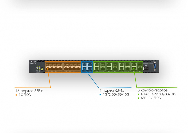 В максимальной конфигурацииXS3800-28 поддерживает 24 оптических порта 10G или 12 медных портов 10G, чтопозволяет выбрать наиболее подходящую комбинацию портов для вашей сети.