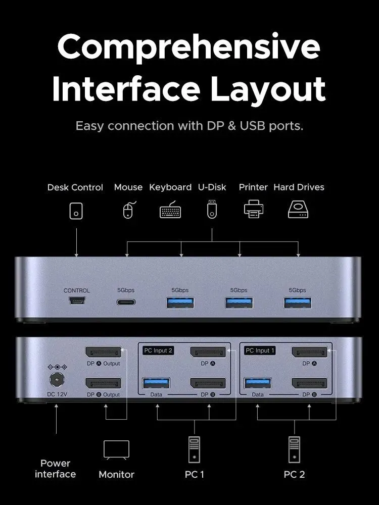 UGREEN AK700 (55851) — это высокопроизводительный KVM-переключатель, разработанный для эффективного управления двумя компьютерами с использованием двух мониторов DisplayPort и одного комплекта периферийных устройств.