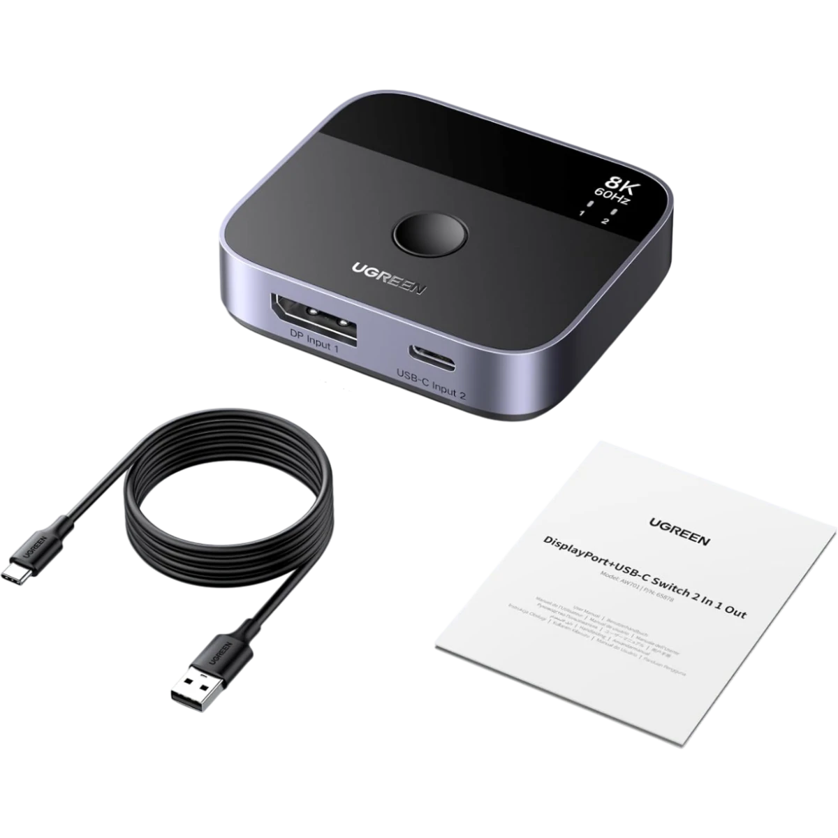 Переключатель UGREEN AW701 (65878) 2 in 1 8K@60Hz DisplayPort&USB-C Switcher. Цвет: черный