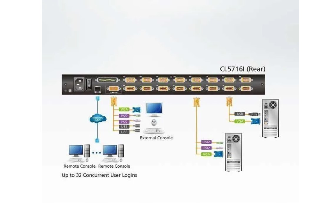 КВМ-переключатель с ЖК дисплеем CL5716IN основан на использовании IP-подключений, что позволяет локальным и удаленным операторам получать доступ к нескольким компьютерам через Интернет с помощью веб-браузера, используя протокол TC/IP как протокол удаленной связи. KVM Переключатель CL5716IN поддерживает до 32 одновременных подключений пользователей, осуществляя доступ к компьютерам по одной шине.