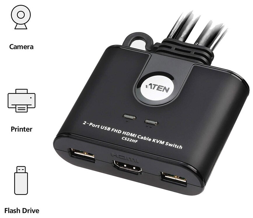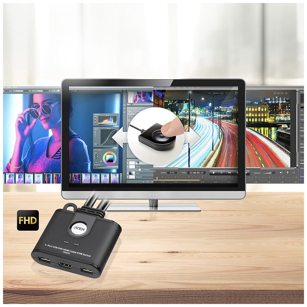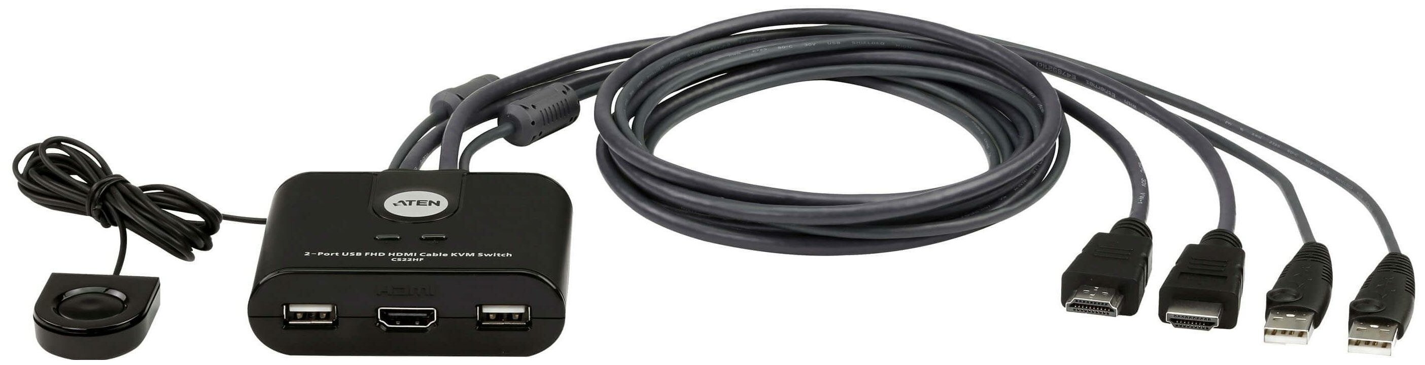 2-портовый, USB, FHD HDMI, кабельный KVM-переключатель CS22HF, является устройством управления, которое с помощью одной консоли, оснащенной портами USB и HDMI, предоставляет доступ к двум компьютерам с превосходным качеством изображения до 1920 x 1080 при 60 Гц / 1920 x 1200 при 60 Гц. Используя кнопку на пульте удаленного переключения порта, Вы можете быстро и легко переключаться между двумя компьютерами. Поддерживая выполнение действий на разно-платформенных системах, CS22HF позволяет переключаться между двумя компьютерами, работающими под управлением различных ОС.