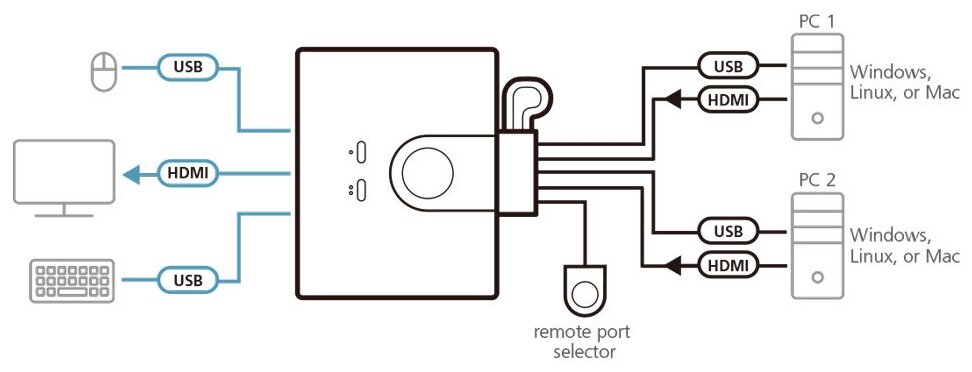 Управление двумя компьютерами с интерфейсами USB и HDMI с помощью одной KVM-консоли