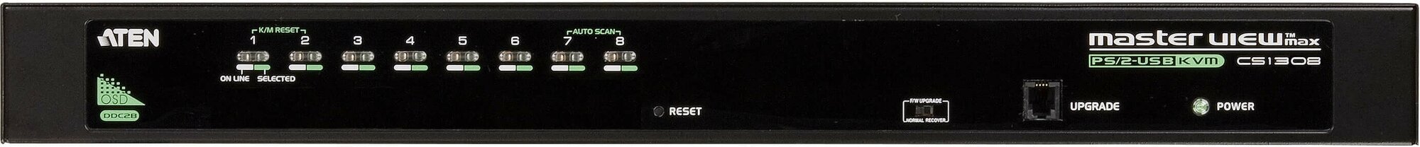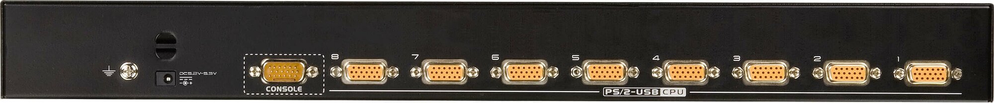 Интерфейсы Консоль: 1 x SPHD-18 Male (Желтый); Порты KVM: 8 x SPHD-17 Female (Желтый); Шлейфовое подключение: 1 x DB-25 Male (Черный); Питание: 1 x DC Jack; LAN: 1 x RJ45, Fеmale; Обновление встроенного ПО: 1 х RJ11; USB порт (1.1): 1 x USB Тип А