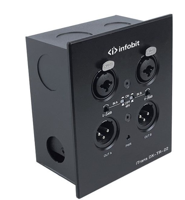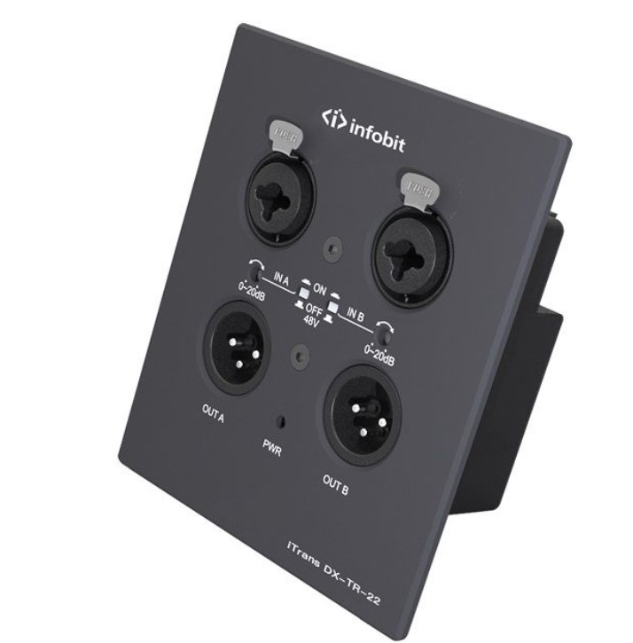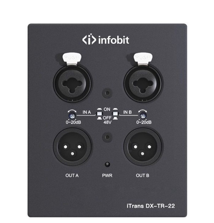 Конвертер имеет 2 аналоговых входа XLR(F), 2 аналоговых выхода XLR(M), 1xRJ45 (Dante), поддержка фантомного питания