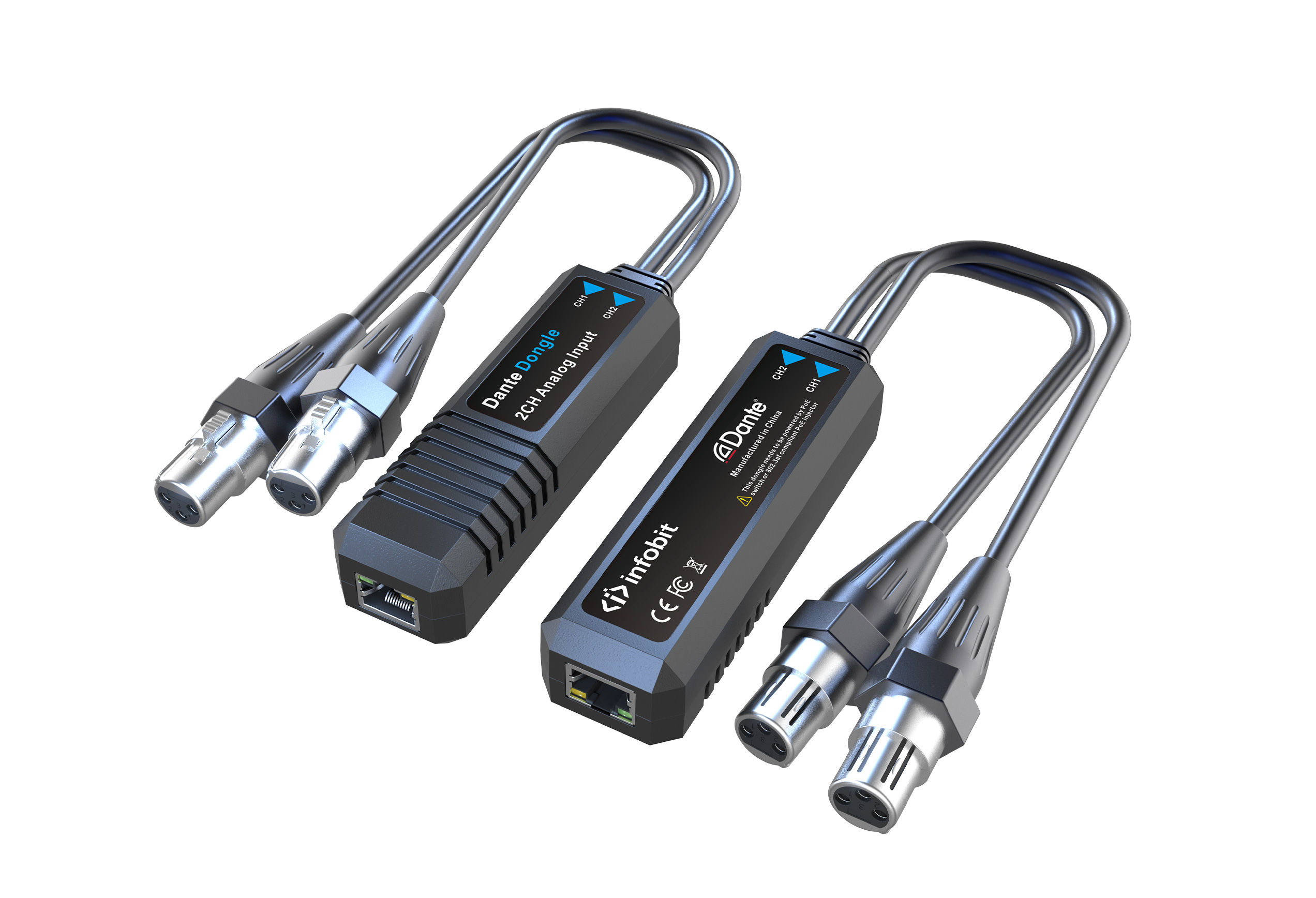 Конвертер, аналог - Dante (передатчик), 2 аналоговых входа XLR(F), 1xRJ45(Dante). Питание PoE 125мм. Новая версия