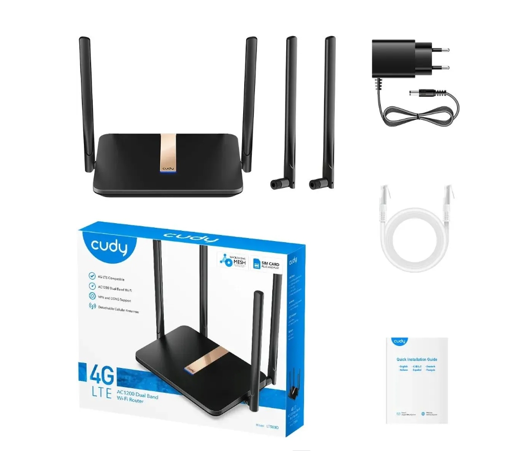 4G LTE WiFi роутер, адаптер питания, RJ45 Ethernet кабель, руководство быстрой установки