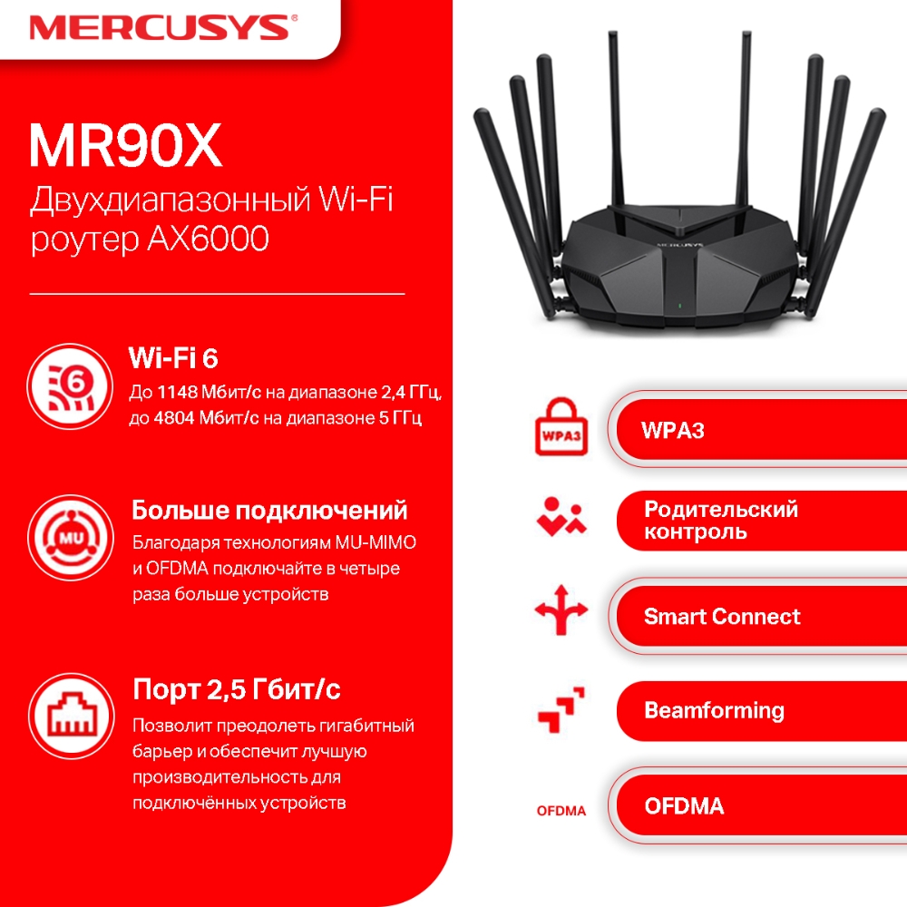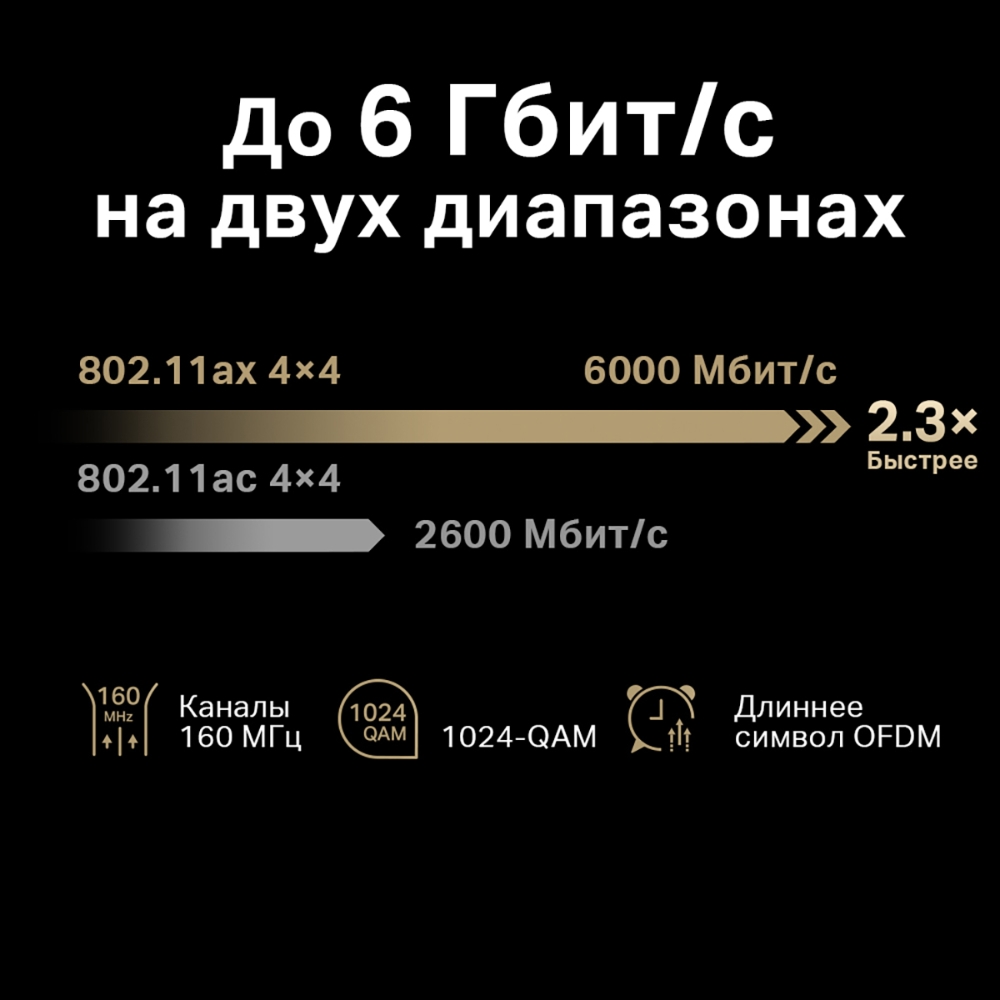 До 1148 Мбит/с на 2,4 ГГц, до 4804 Мбит/с на 5 ГГц