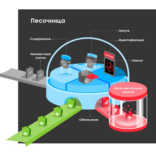Песочница - это изолированная среда в облаке, куда помещаются подозрительные файлы для идентификации новых типов вредоносного кода, которые нельзя выявить с помощью традиционных механизмов статичной защиты. Песочница гарантирует защиту от атак zero-day.