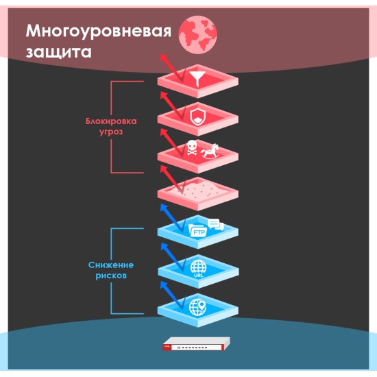 Число кибератак постоянно увеличивается, как и их разнообразие, включая шифровальщики, вредоносный код, различные варианты программ-вымогателей и другие угрозы. Межсетевой экран ZyWALL ATP с помощью интеллекта умного облака обеспечивает надежную защиту от этих угроз Advanced Persistent Threat (APT), реализуя полную многоуровневую оборону от будущих ранее неизвестных атак