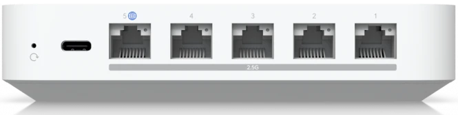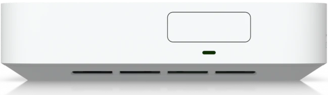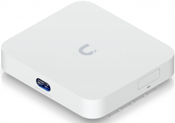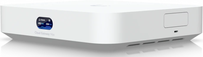 Физические интерфейсы шлюза-концентратора Cloud Gateway Max 512 GB UCG-Max включают небольшой жидкокристаллический дисплей, индикаторы Ethernet и кнопку сброса.