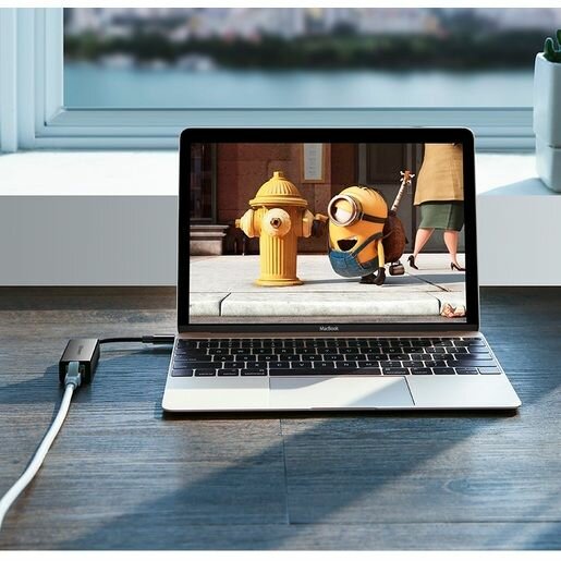 На одном конце переходника коннектор Type-C, который вставляется в порт ноутбука. Коннектор совместим с интерфейсом Thunderbolt 3.