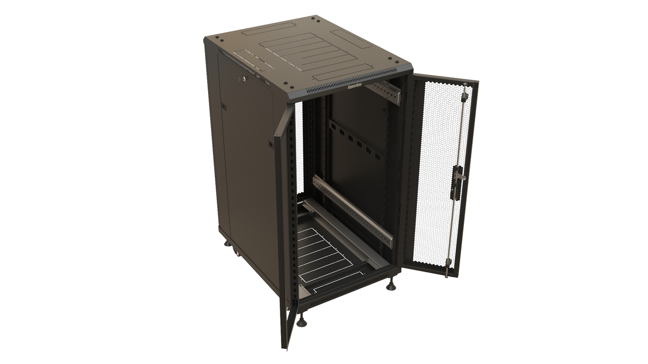 Комплект поставки: Сборный каркас: передняя и задняя рамы каркаса Верхняя и нижняя панели каркаса (крыша и пол) Щеточный кабельный ввод - 1 шт. (для установки в верхнюю или нижнюю панель) Передняя и задняя двери (в комплекте с ручками и замками) Съемные боковые панели с защелками и замками - 2 шт. 19" монтажные профили - 4 шт. Горизонтальные монтажные профили - 4 шт. Регулируемые ножки - 4 шт. Транспортировочные ролики - 4 шт. Крепежный комплект (винты, гайки, шайбы) Комплект заземления (кабели, гайки, шайбы)