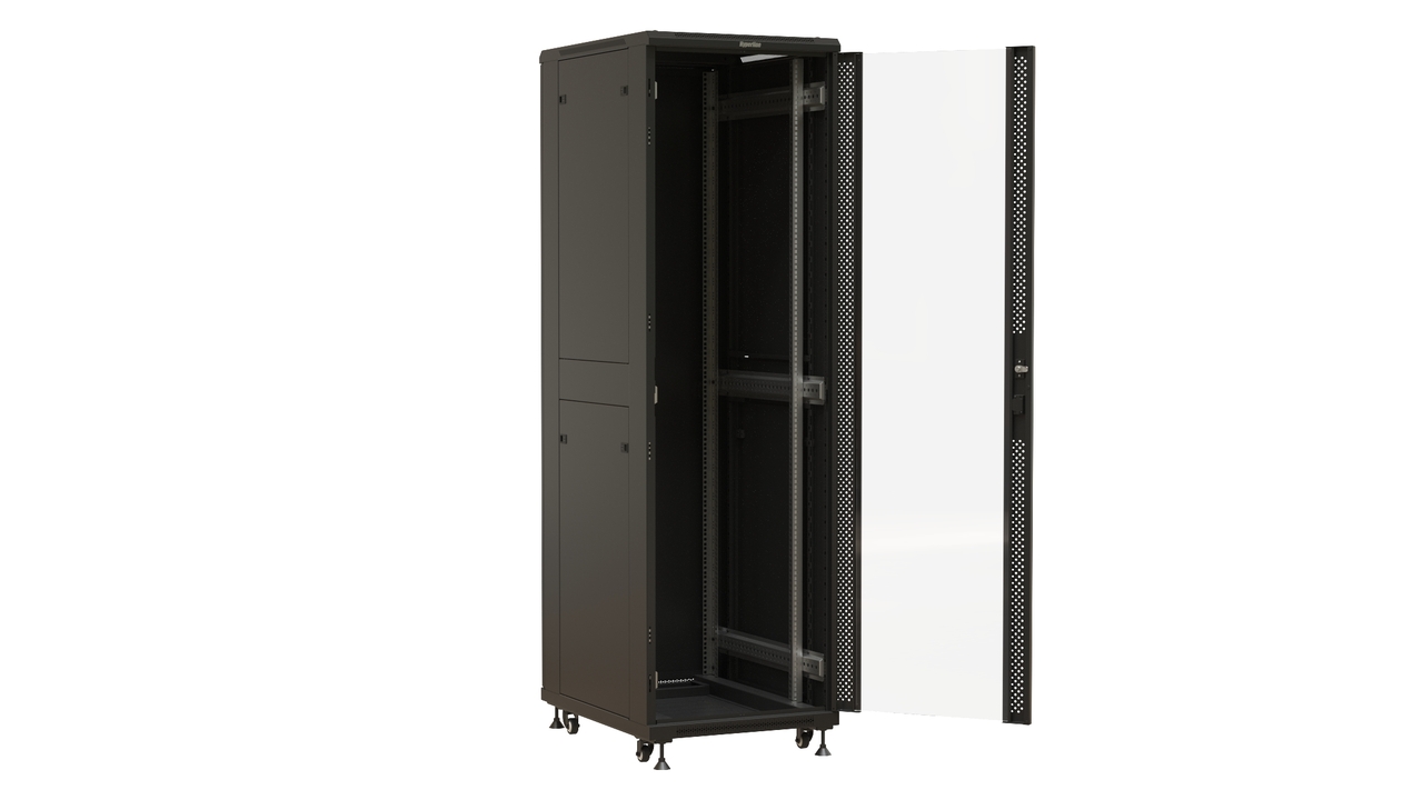Подробное описание материалов: Холоднокатаная сталь SPCC; Закаленное стекло толщиной 4,0 мм; Толщина стальных компонентов: рама каркаса, верхняя, нижняя и боковые панели, передняя и задняя двери – 1,2 мм; поперечный монтажный профиль – 1,5 мм; 19” монтажные профили – 2,0 мм