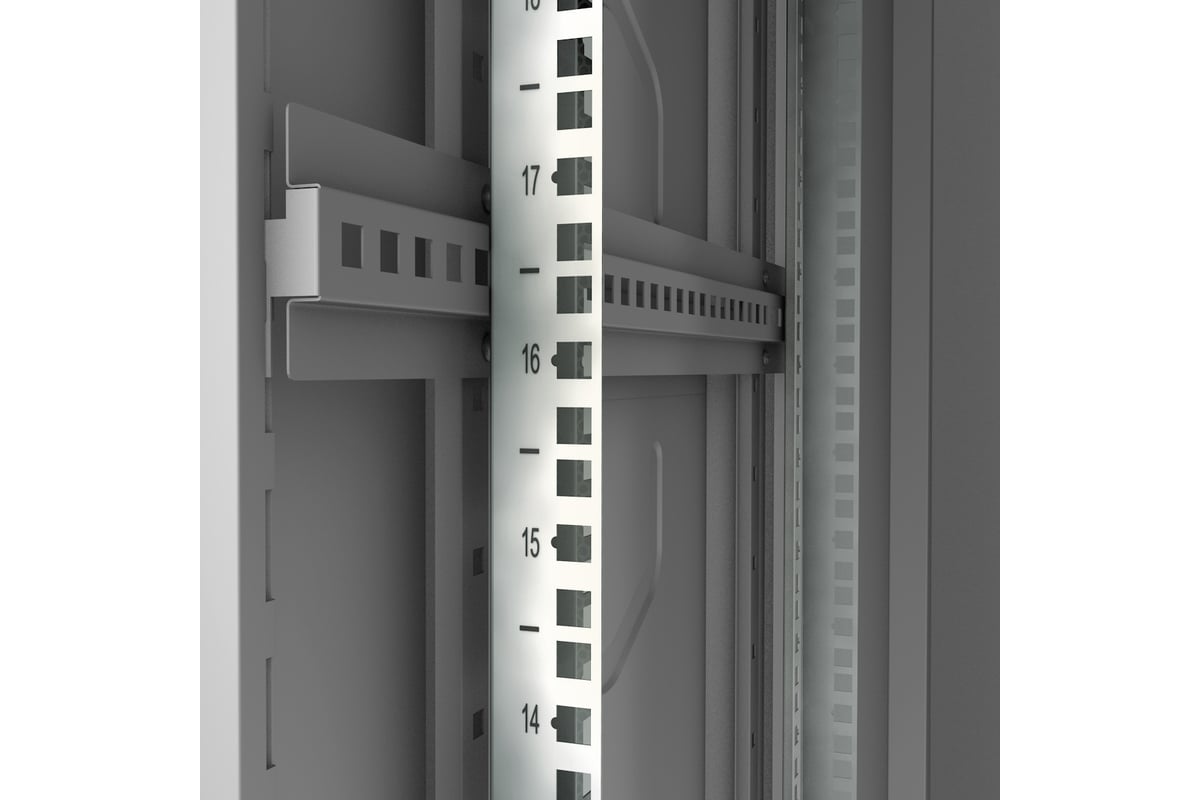 Четыре 19" монтажных L - профиля, имеют юнитовую (U) разметку в соответствии со стандартом DIN 41494-7, глубина установки направляющих может изменяться в зависимости от устанавливаемого оборудования.