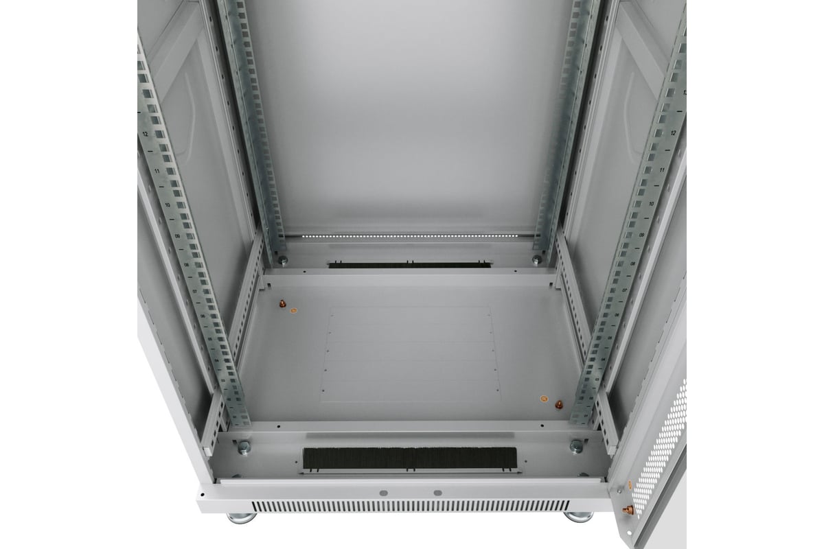 В основание шкафа и в крыше предусмотрены щеточные вводы для защиты оборудования от пыли при вводе информационного и силового кабеля. В шкафу великолепно продумана естественная (пассивная) вентиляция, за счет перфорации в корпусе шкафа и на передней дверце. А так же, конструктивно, предусмотрена установка активной вентиляции.