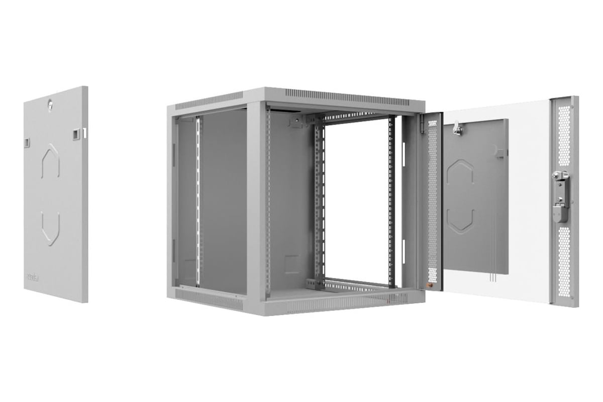 Передняя дверь комплектуется поворотной ручкой с замком. Крыша шкафа имеет перфорацию. Крыша и основание шкафа имеют отверстия для ввода кабеля. Вертикальные направляющие регулируются по глубине. Боковые стенки съемные.