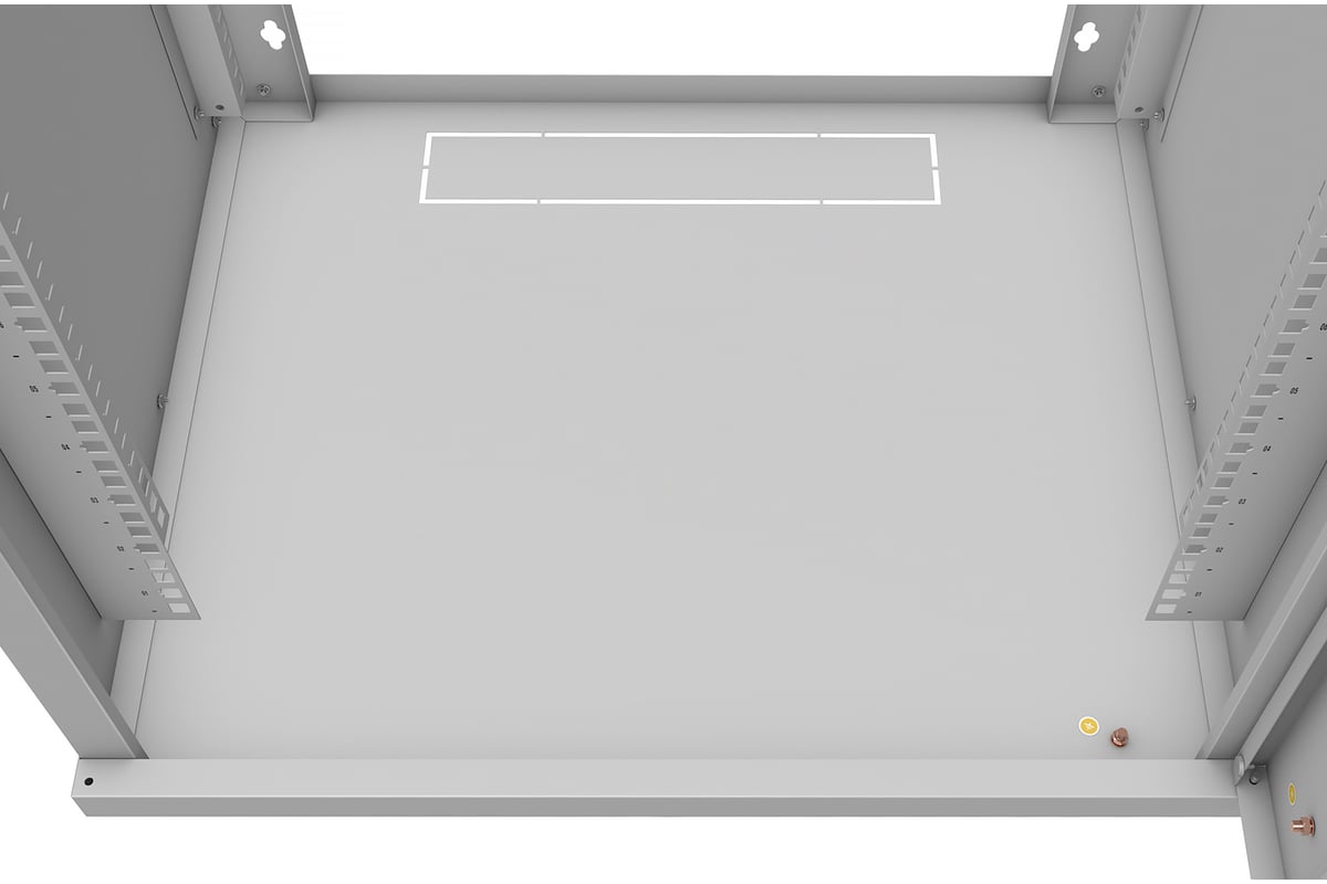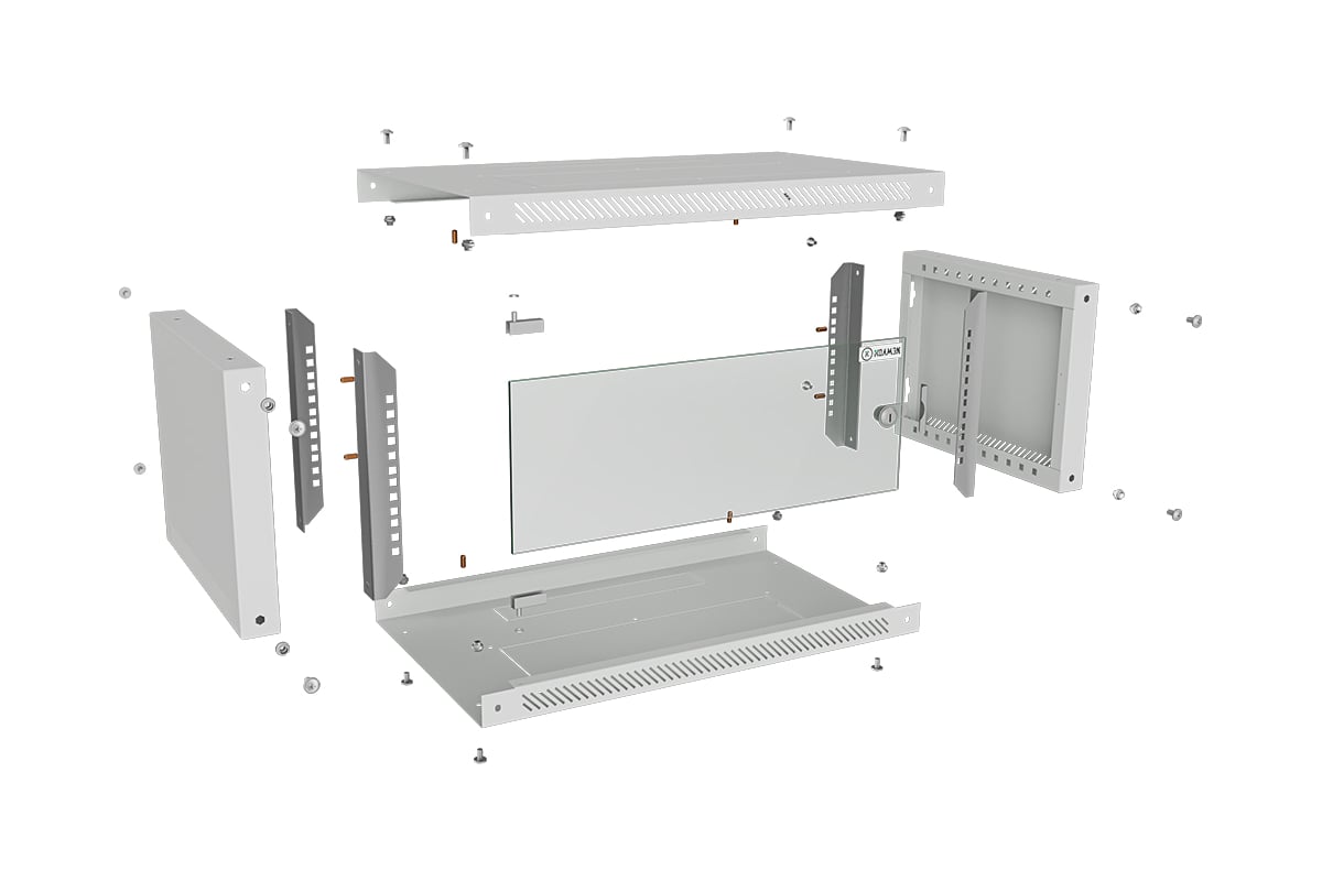 Шкаф представляет собой разборную конструкцию, состоящую из двух боковин, крыши, основания и передней двери. Передняя дверь комплектуется точечным замком. Крыша шкафа имеет перфорацию. Крыша и основание шкафа имеют отверстия для ввода кабеля. Вертикальные направляющие не регулируются по глубине. Боковые стенки не съемные. Оборудование располагается на вертикальных направляющих.