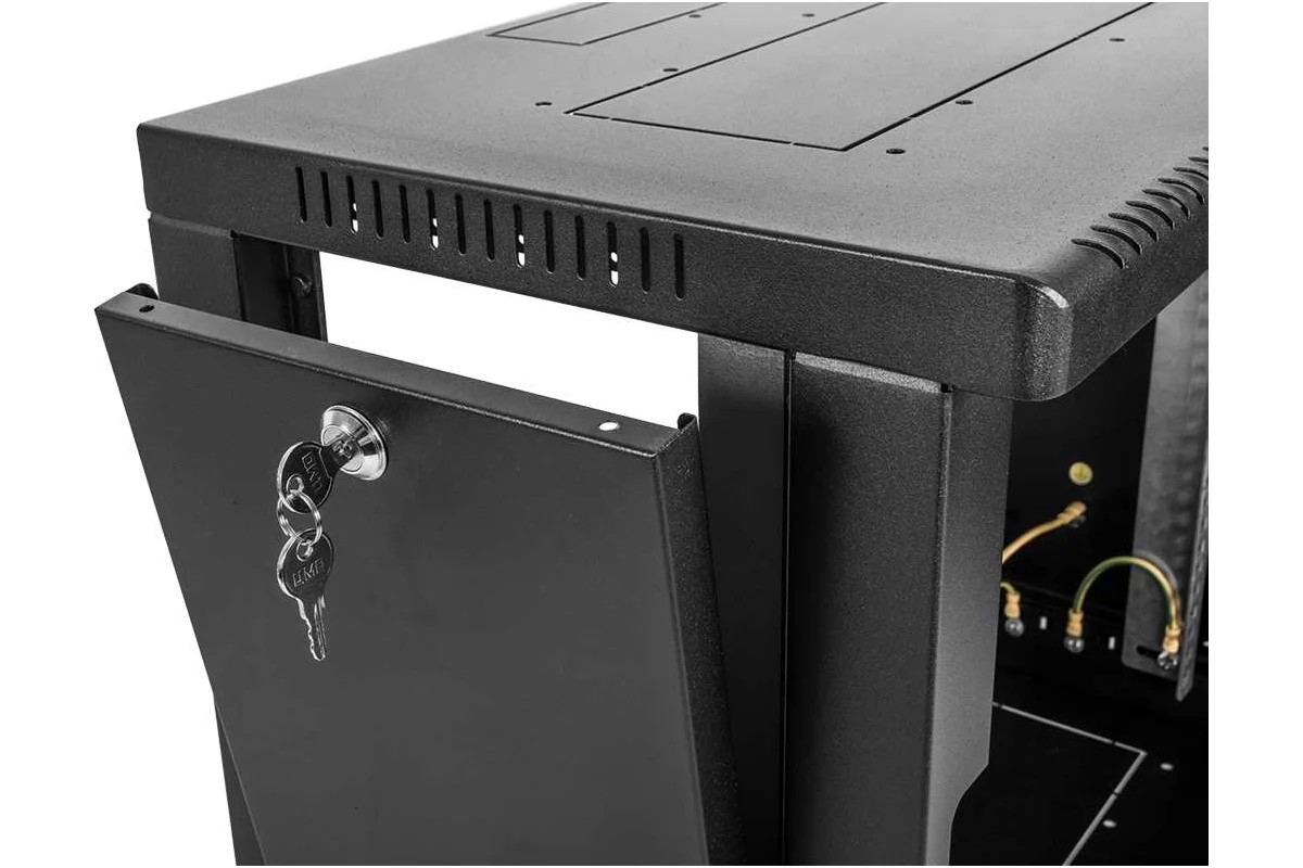 Настенный шкаф 19" ШРН имеет цельнометаллическую сварную конструкцию, он удобен для быстрой установки и монтажа оборудования, так как не требует сборки. Отсутствие острых углов с фронтальной стороны повышают безопасность при эксплуатации и обслуживании шкафов, что помогает исключить человеческие травмы при соприкосновении со шкафом. Комплектация дверью с тонированным ударопрочным стеклом. Новая конструкция стеклянной двери с механическим креплением стекла увеличивает её жесткость, и обеспечивает легкую замену стекла при его повреждении. Возможна установка двери, как с правой, так и с левой стороны. Новый усиленный точечный замок с поворотной ручкой увеличивает жесткость фиксации двери в закрытом положении и защиту от несанкционированного доступа, а также обеспечивает удобство при её открывании.