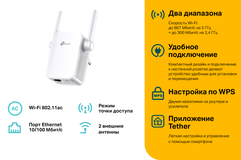 RE305 позволит подключать больше устройств одновременно на 2,4 ГГц (скорость до 300 Мбит/с) и на 5 ГГц (скорость до 867 Мбит/с). Используйте 2,4 ГГц для отправки e-mail и работы в интернете, а 5 ГГц – для онлайн-игр и просмотра HD-видео.
