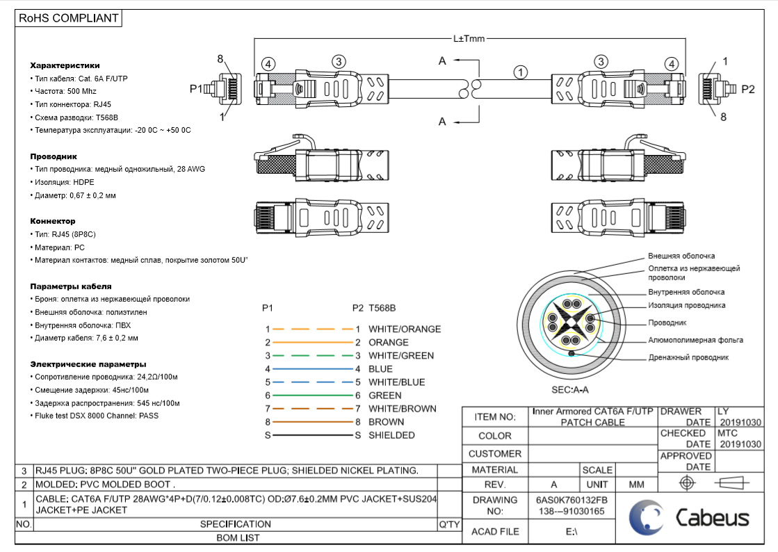 Диаметр кабеля: 7,6 мм ±0,2 мм