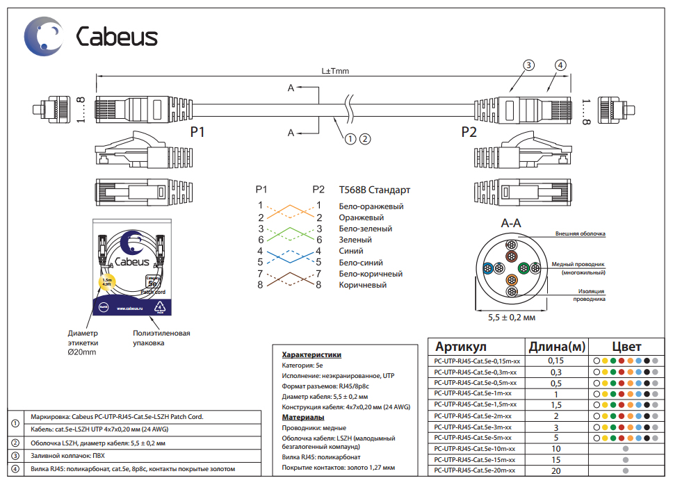 Диаметр кабеля: 5,5 мм ± 0,2 мм