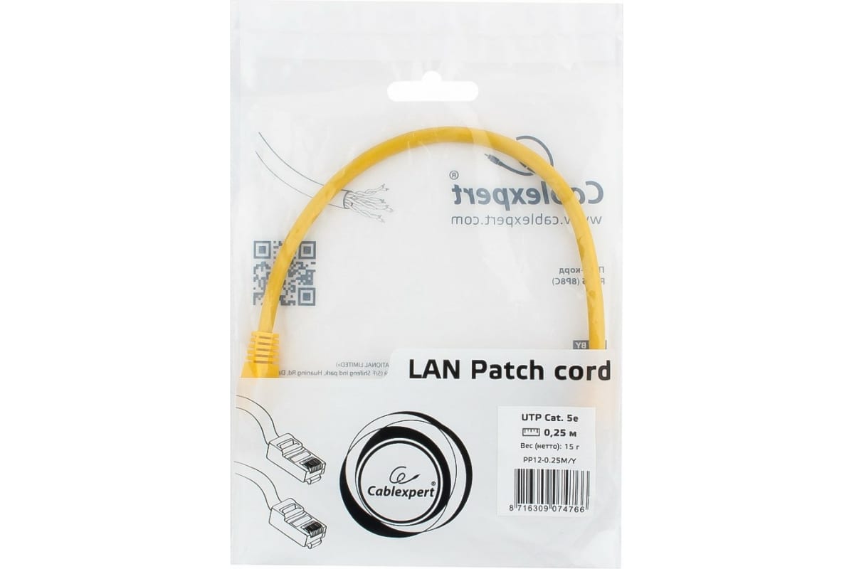 Технические характеристики Cablexpert UTP PP12-0.25M/Y категории 5e, 0.25м, жёлтый PP12-0.25M/Y