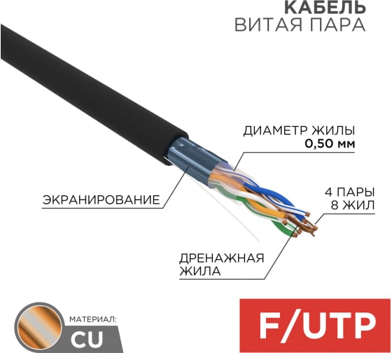 Технические характеристики REXANT 4PR 24AWG CAT5e 305м OUTDOOR 01-0146