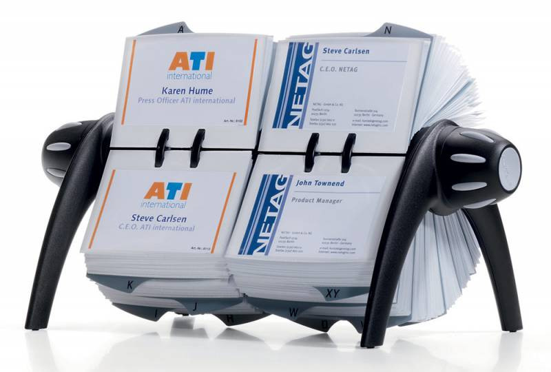 Особенности: Вращающаяся настольная визитница удвоенной емкости для хранения 600 визитных карточек. Комплектуется 300 двусторонними съемными карманами, буквенным разделитем A-M и N-Z, а также имеет 40 карточек для записи адресов и телефонов. Можно увеличивать емкость визитницы до 800 карточек при помощи дополнит