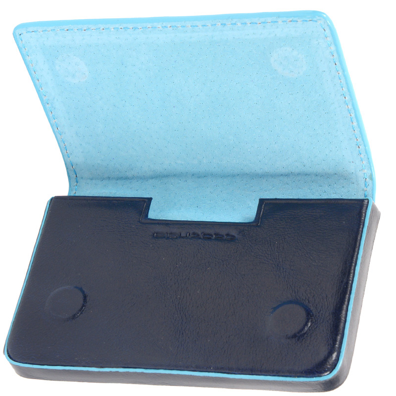 Описание: Чехол для визитных карт, натуральная кожа. Фиксация клапана - магнитными защелками. Оторочка по канту и подкладка - голубым. Фирменная упаковка.