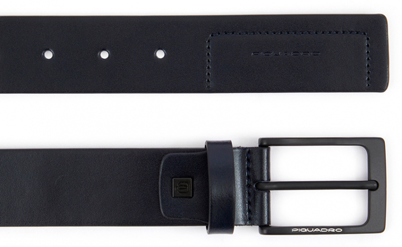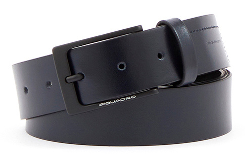 Мужской ремень с пряжкой и шпеньком от компании Piquadro, коллекция Finn. Натуральная телячья кожа синего цвета. Фирменная упаковка.
