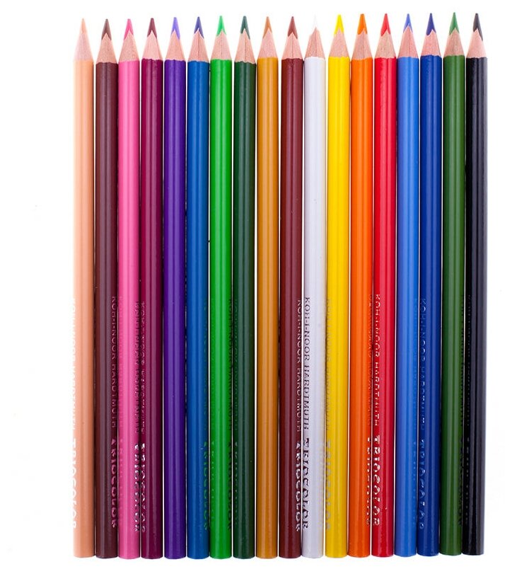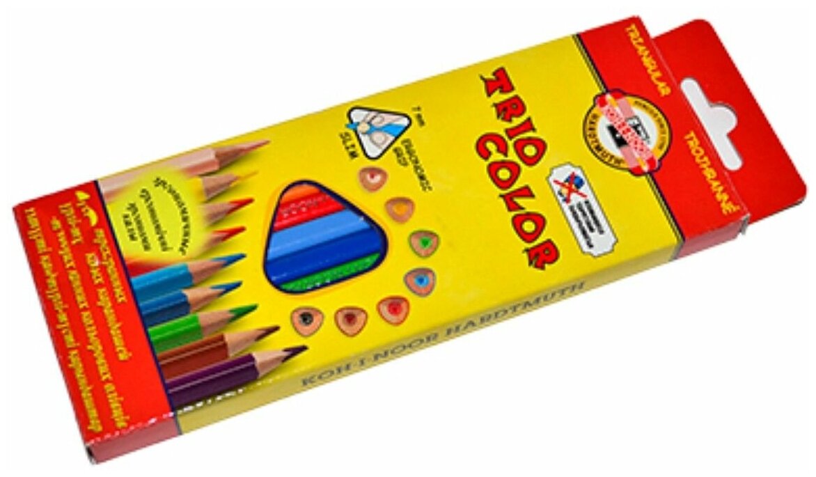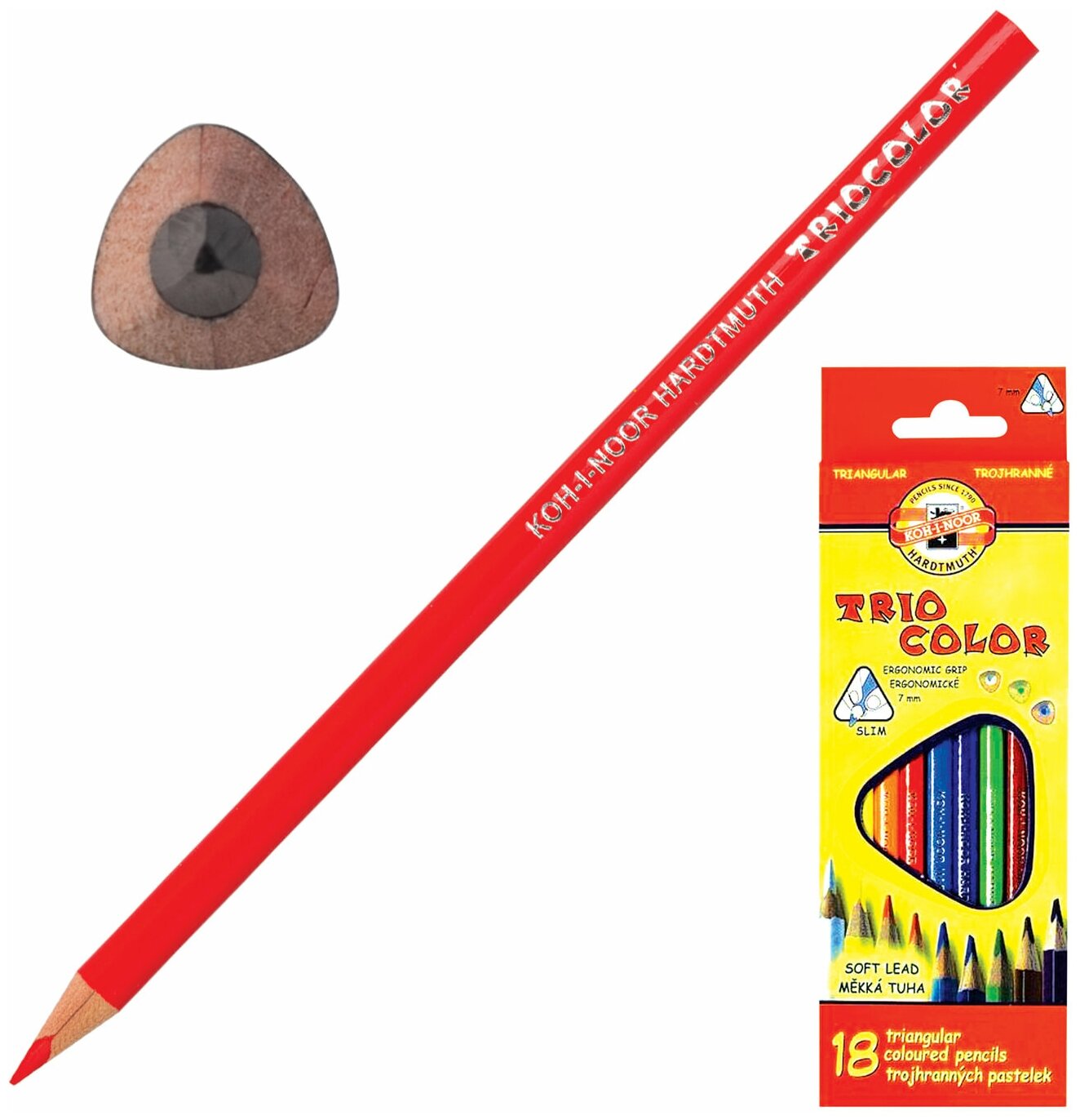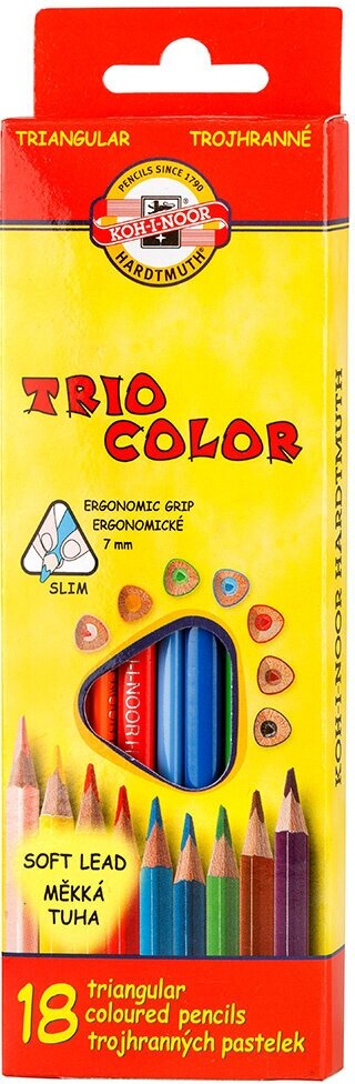 Карандаши цветные Koh-i-Noor Triocolor 18 цветов — очень мягко пишут и легко затачиваются, благодаря корпусу из высококачественной древесины. Имеют треугольную эргономическую форму. Грифель толщиной 3,2 мм мягко ложится на бумагу, рисование не требует сильного нажима.