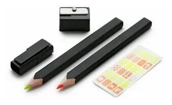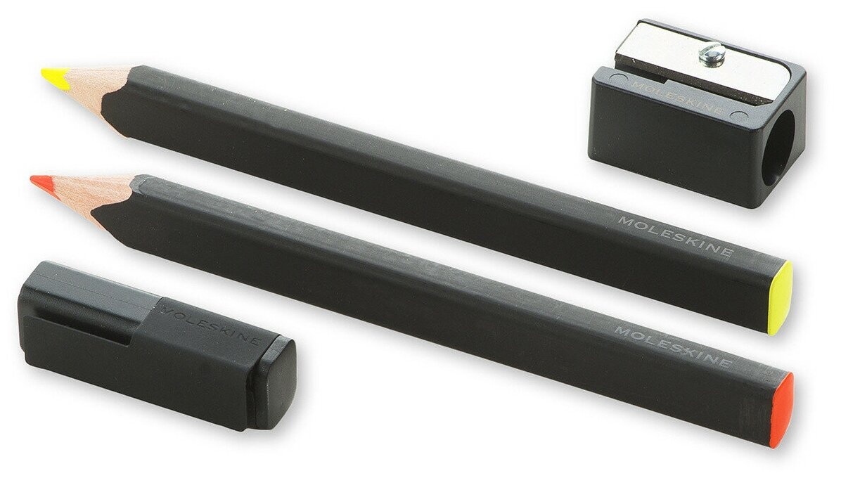 Набор карандашей Moleskine из новой серии Moleskine Writing Accessories Set – это настоящий подарок любителям рисовать. В набор входят 2 прямоугольных карандаша желтого и оранжевого цвета со скругленными гранями и специальная точилка для них. Карандаш Moleskine – это стильный и удобный карандаш, изготовленный из кедровой древесины и идеально подходящий для письма и рисования на гладкой кремовой бумаге Moleskine. Точилка Moleskine также выполнена в минималистичном и практичном дизайне. Скругленные уголки, матовая краска – все под тон остальным аксессуарам из набора для письма Moleskine. Она специально создана для прямоугольных карандашей молескин и оснащена превосходным долго не требующим заточки немецким лезвием.